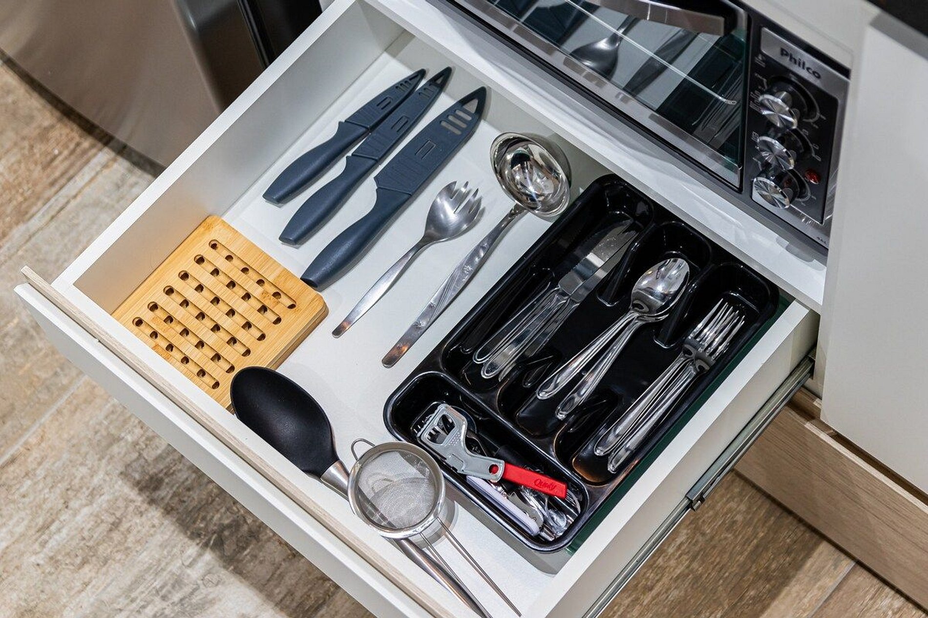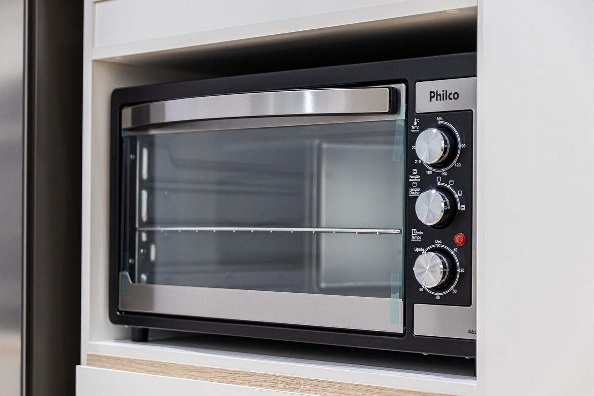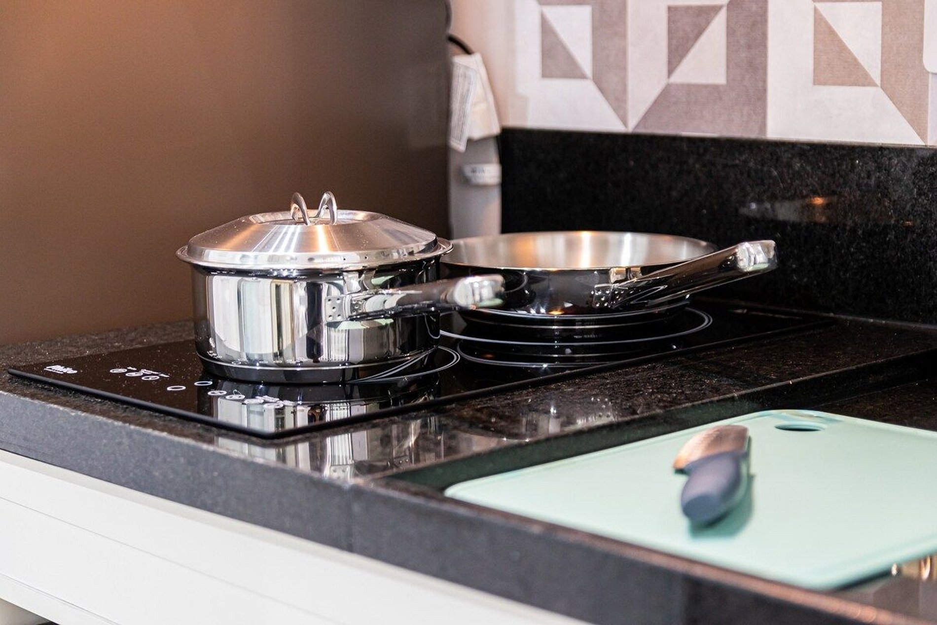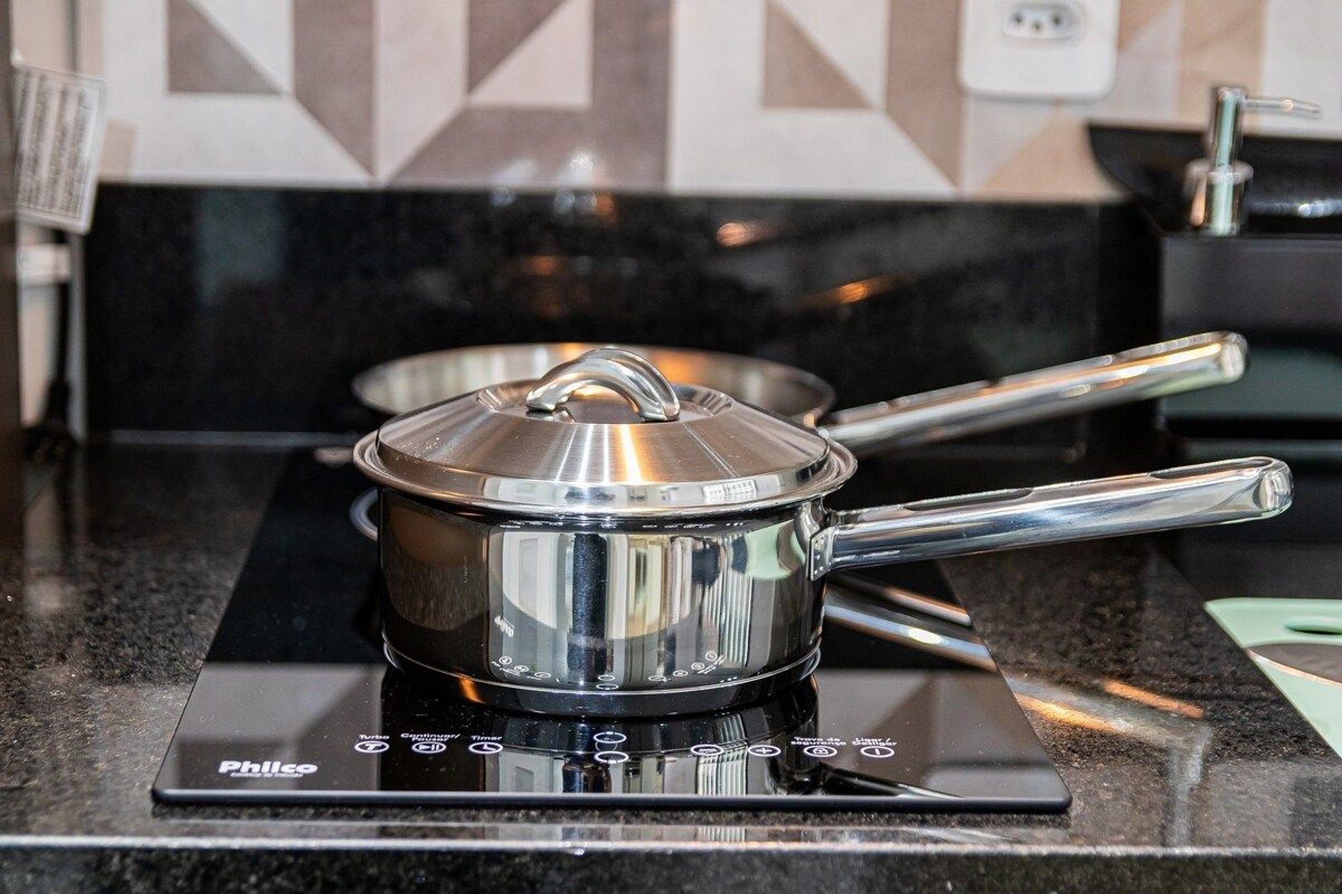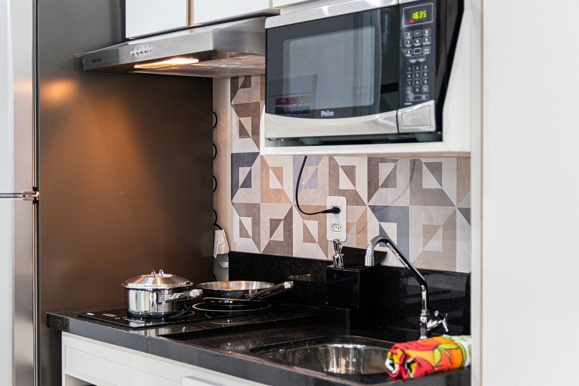 Cozinha completa, equipada com geladeira, microondas, cooktop de indução de duas bocas e forno elétrico.