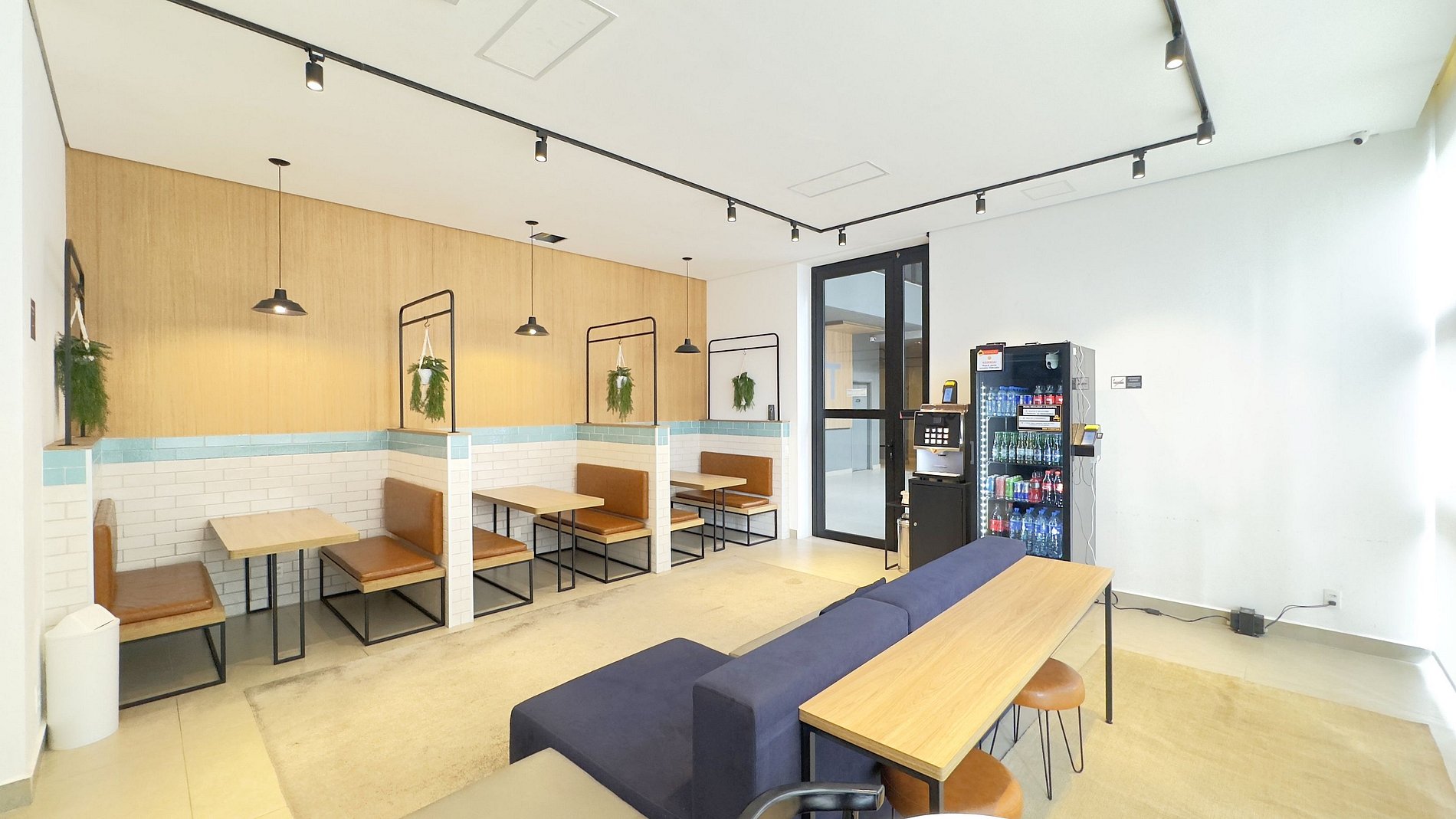 Os hóspedes podem acessar áreas comuns como Piscina, Lavanderia, Coworking e Rooftop.