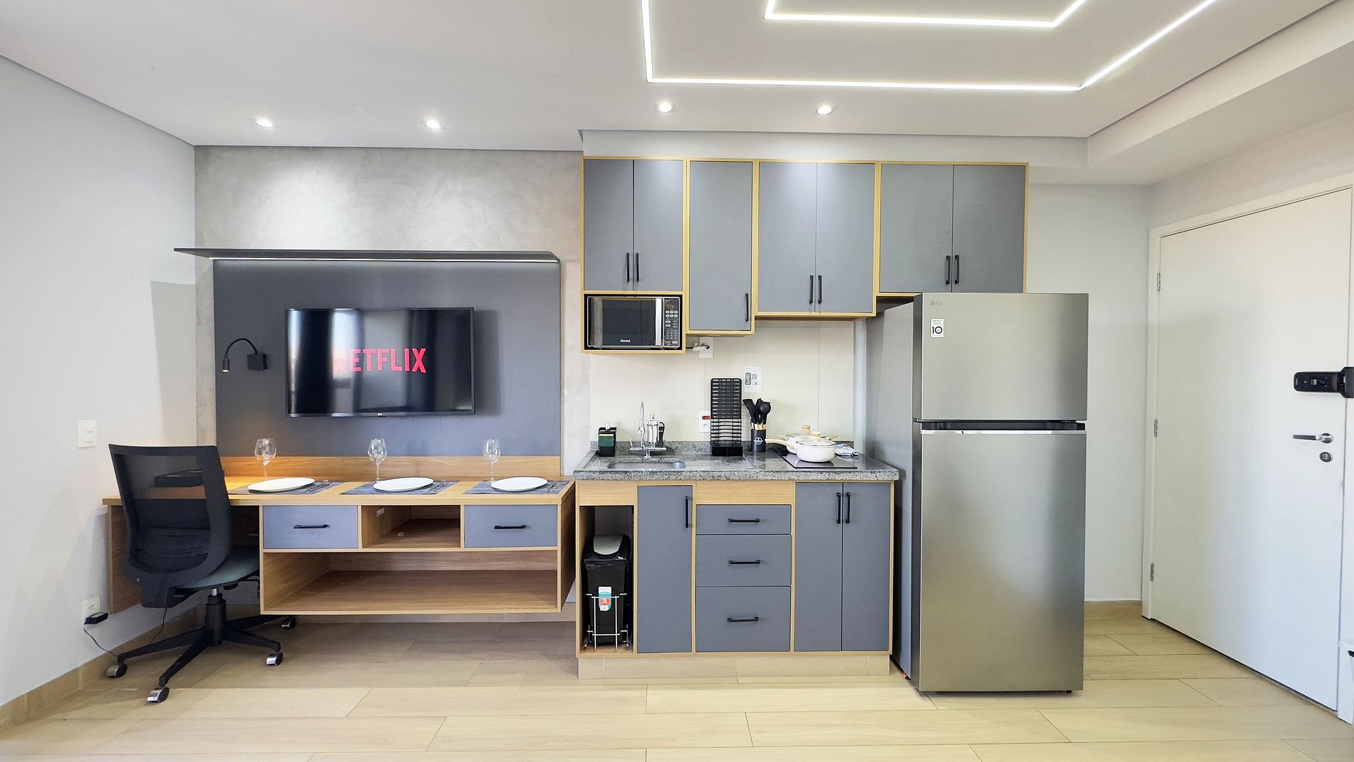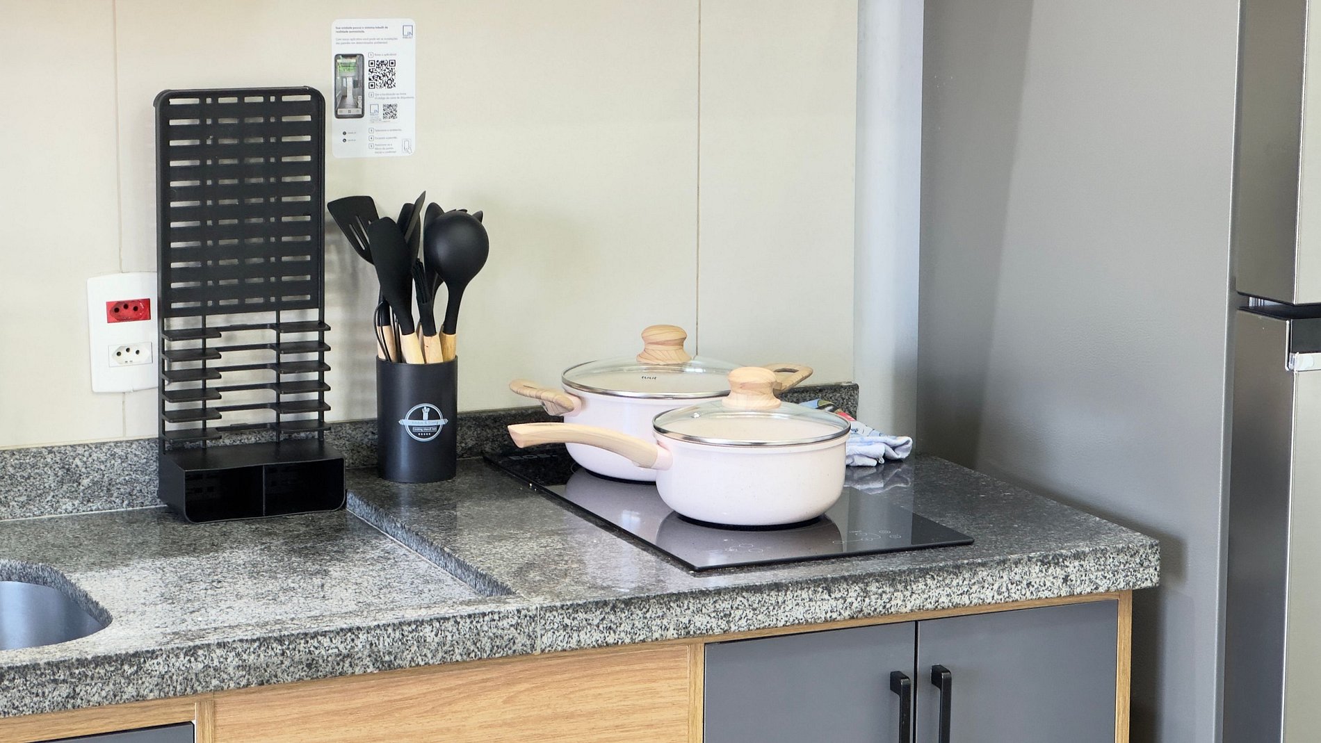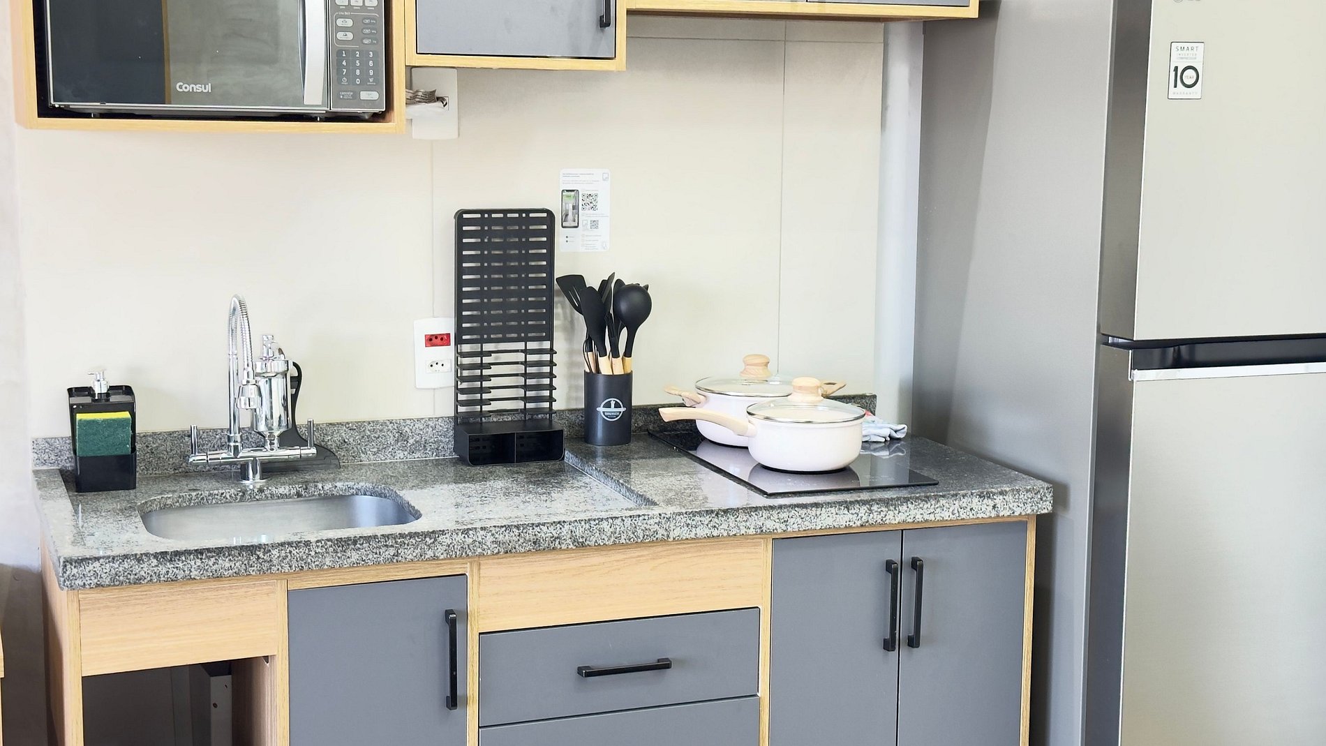 - Cozinha completa, equipada com geladeira, micro-ondas, cooktop de duas bocas e demais utensílios.