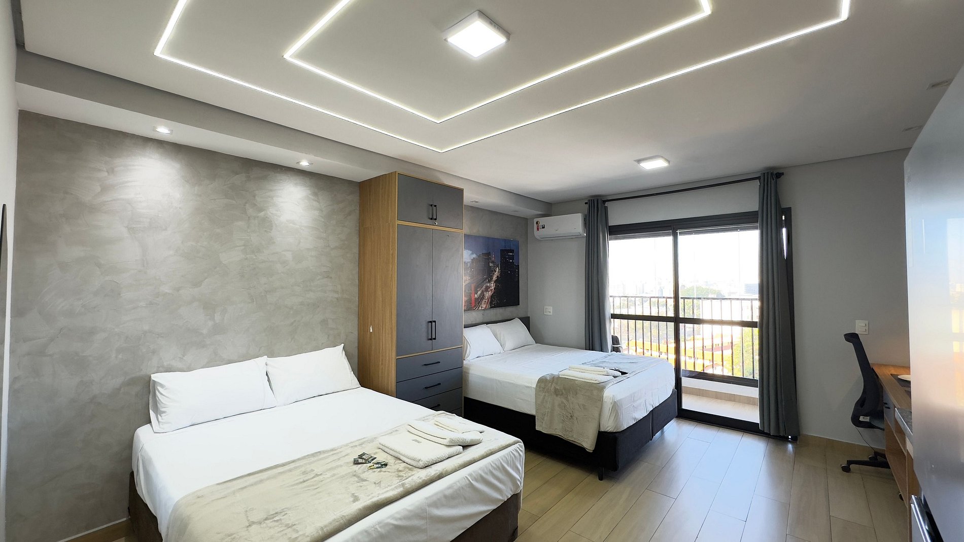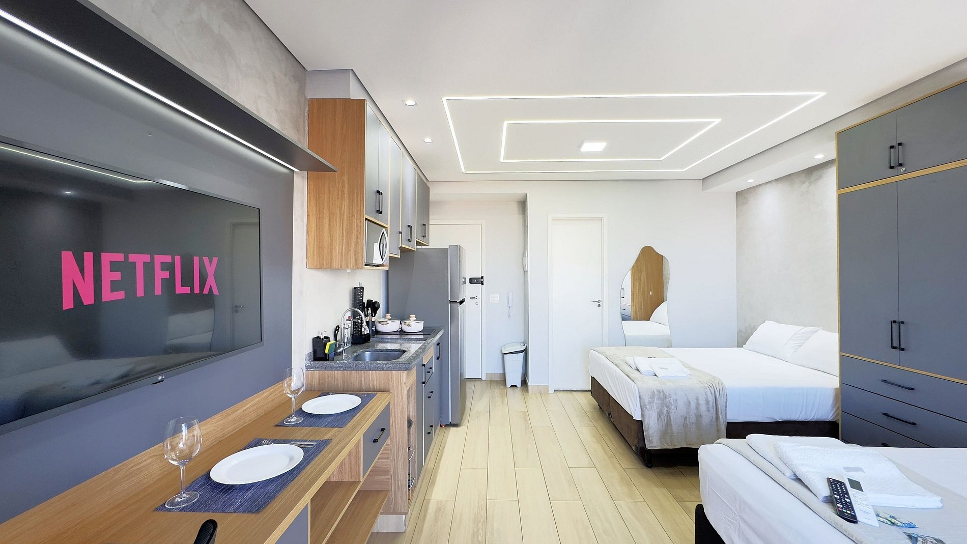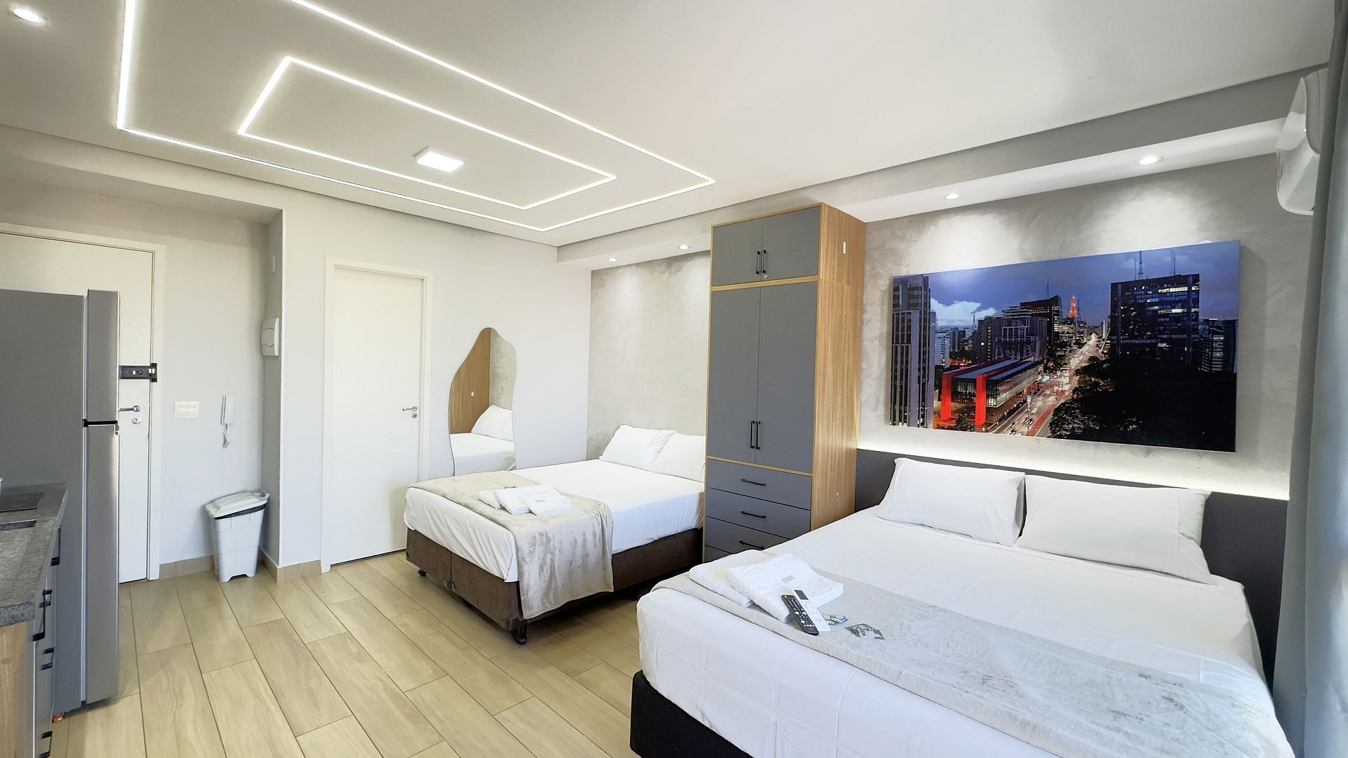 Espaçoso, aconchegante e pensado nos detalhes, o Studio acomoda até 4 hóspedes com conforto, são duas camas, uma sendo Queen e outra Casal Padrão. A decoração é moderna, charmosa e pensada para você se sentir em casa desde o primeiro minuto.