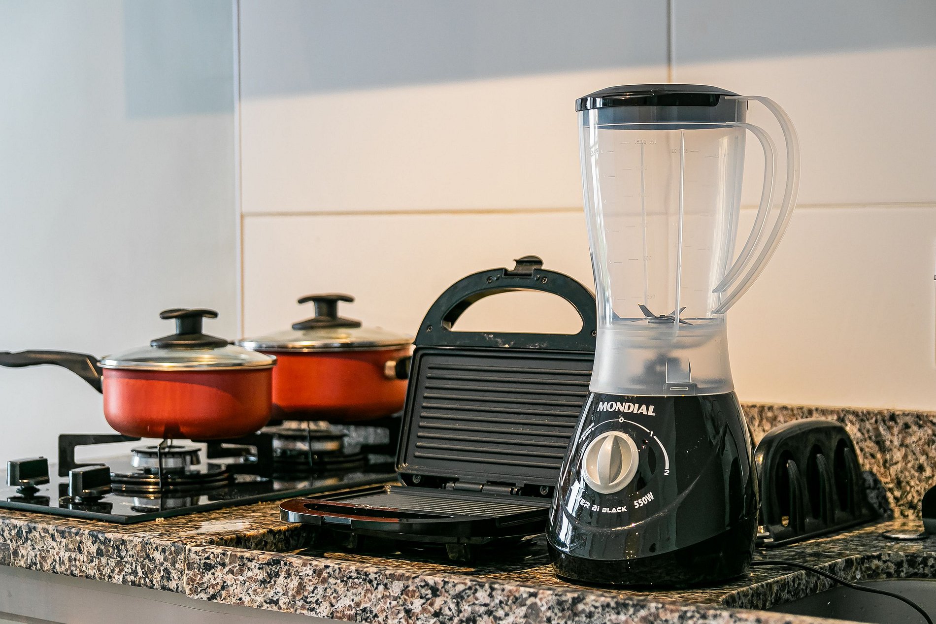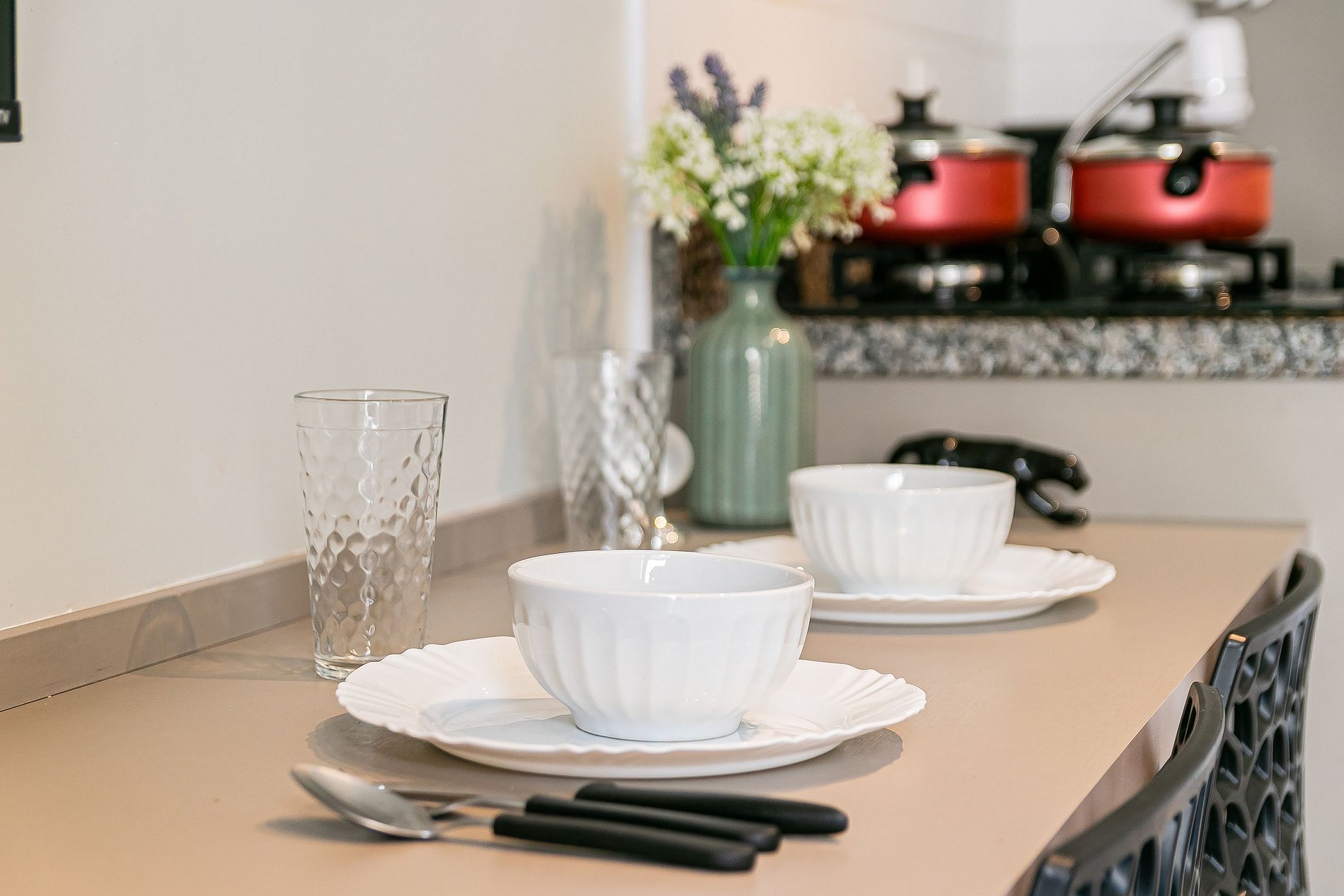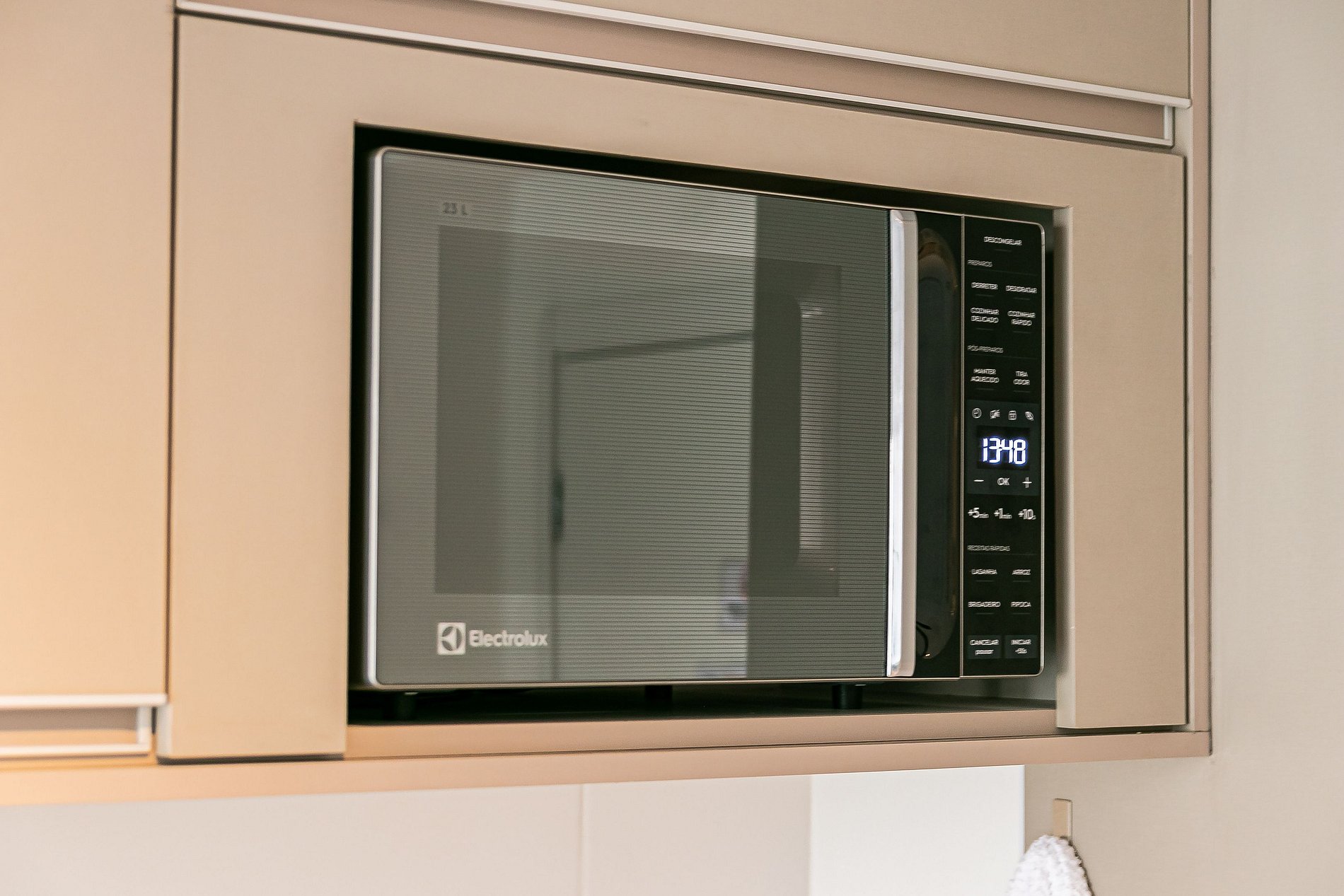- Cozinha completa equipada com geladeira, microondas e cooktop de duas bocas.